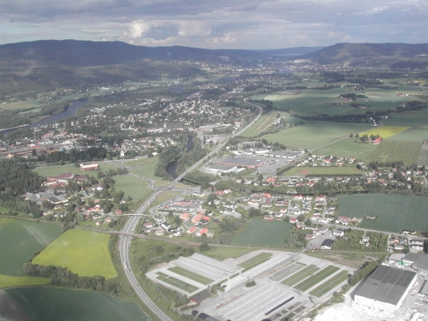 I luften med utsikt østover mot flyplassen og Mjøndalen