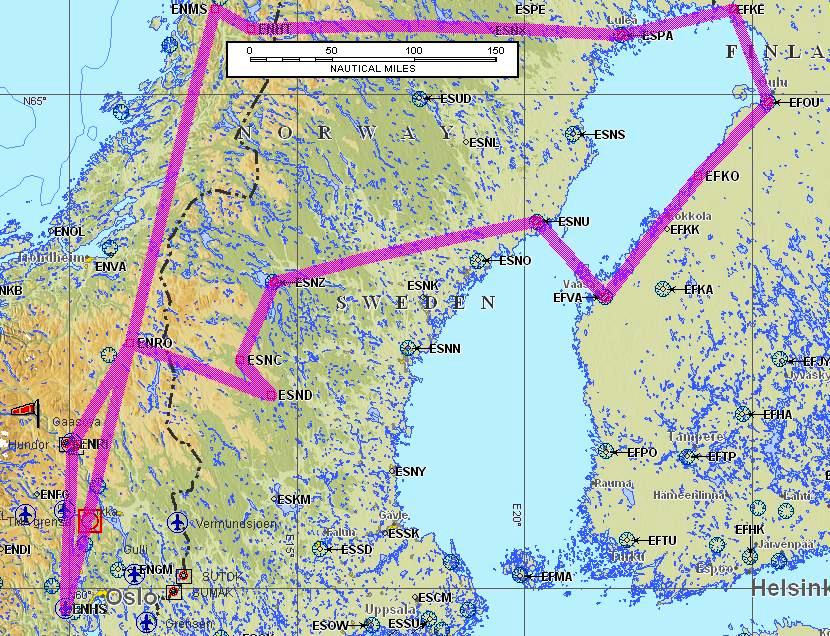 Klikk for større bildeArne Fladby og Jørn R. Sterling har vært på langtur med LN-DFM til fly-in i Hattfjelldal. I utgangspunktet er det en tur på om lag 800-900 nautiske mil tur-retur, men den ble betydelig lengre da turen bl.a. gikk via Kemi, Oulu, Kokkola og Vaasa i Finland på returen! I alt ble turen på ca. 1500 nautiske mil, med en rute omtrent som vist her.