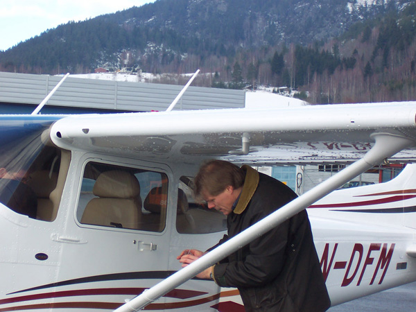 Til tross for at vi er oppunder maks vekt klatrer vi ut mot Follesjø med ca 1000 fot i minuttet, etter litt airwork og noen landingsrunder på ENNO, ville vi se om tåka hadde lettet på Hokksund så vi kunne ta en tur ”hjem” vi hadde inspisert banen før vi dro til Notodden og kommet frem til att det var brukbare forhold, det lå en del lave tåkeskyer under oss men det var åpent over Hokksund, så LN-DFM landet på ENHS for første gang, den 18.2.2007 kl 14.05